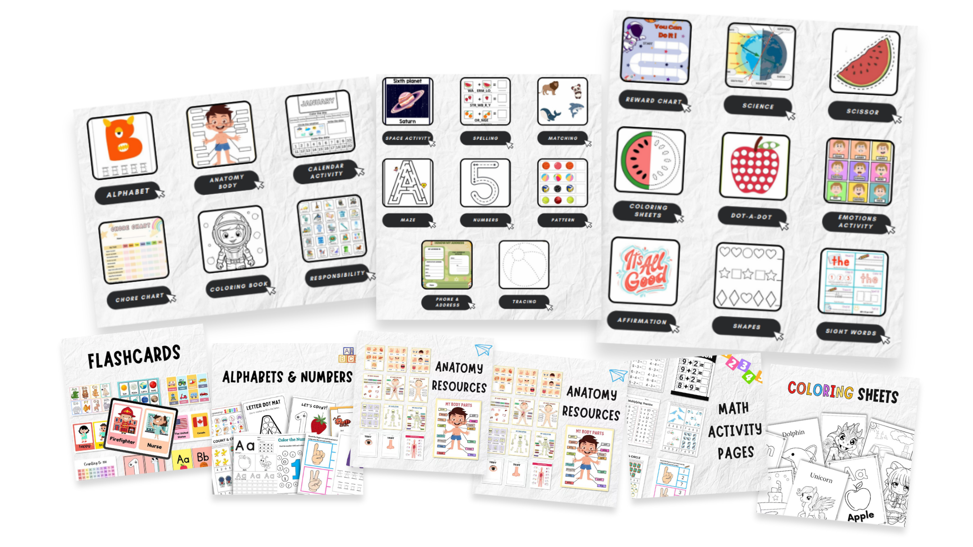 Anda dapat 9 kategory latihan kids untuk kenal tubuh, boleh print anytime, dan edit versi digital